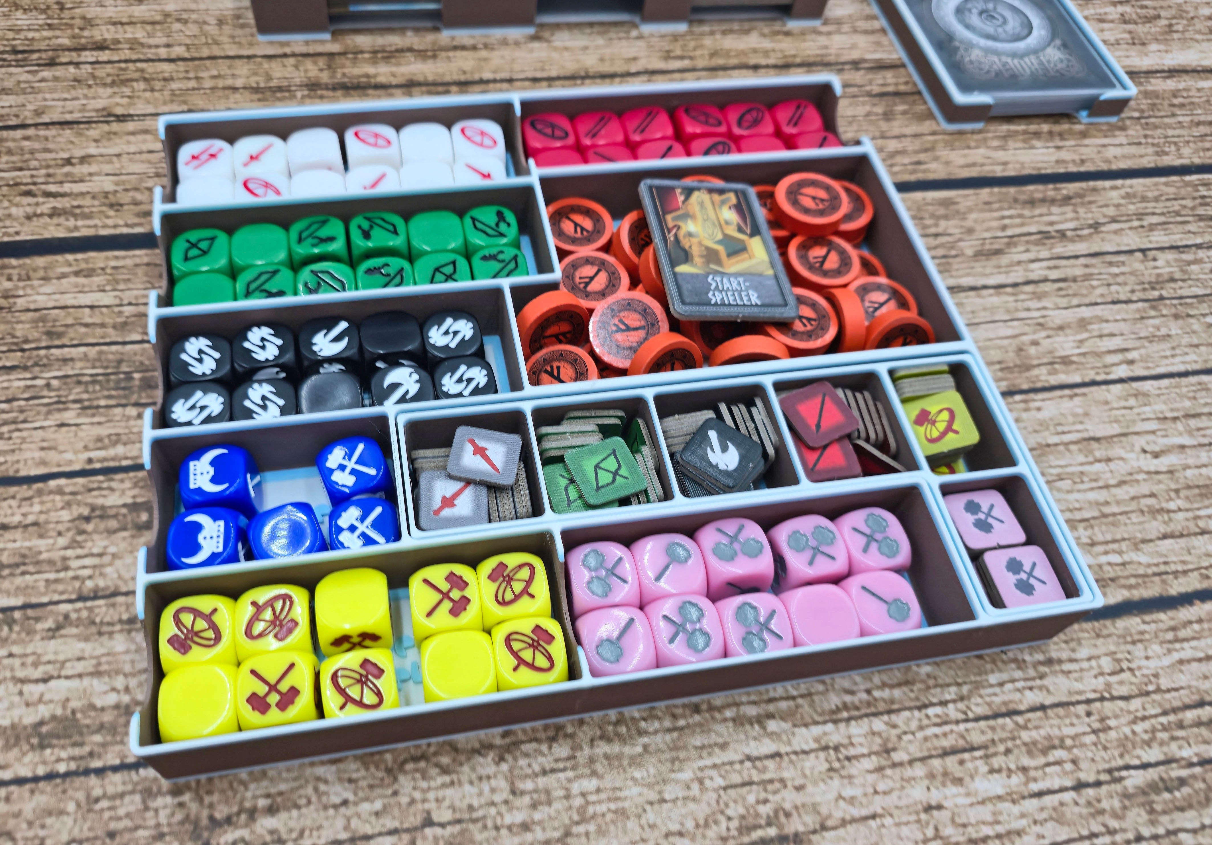 1x Tray für den Startspielermarker, alle Würfel und einem herausnehmbaren Tray für die Opfermarker