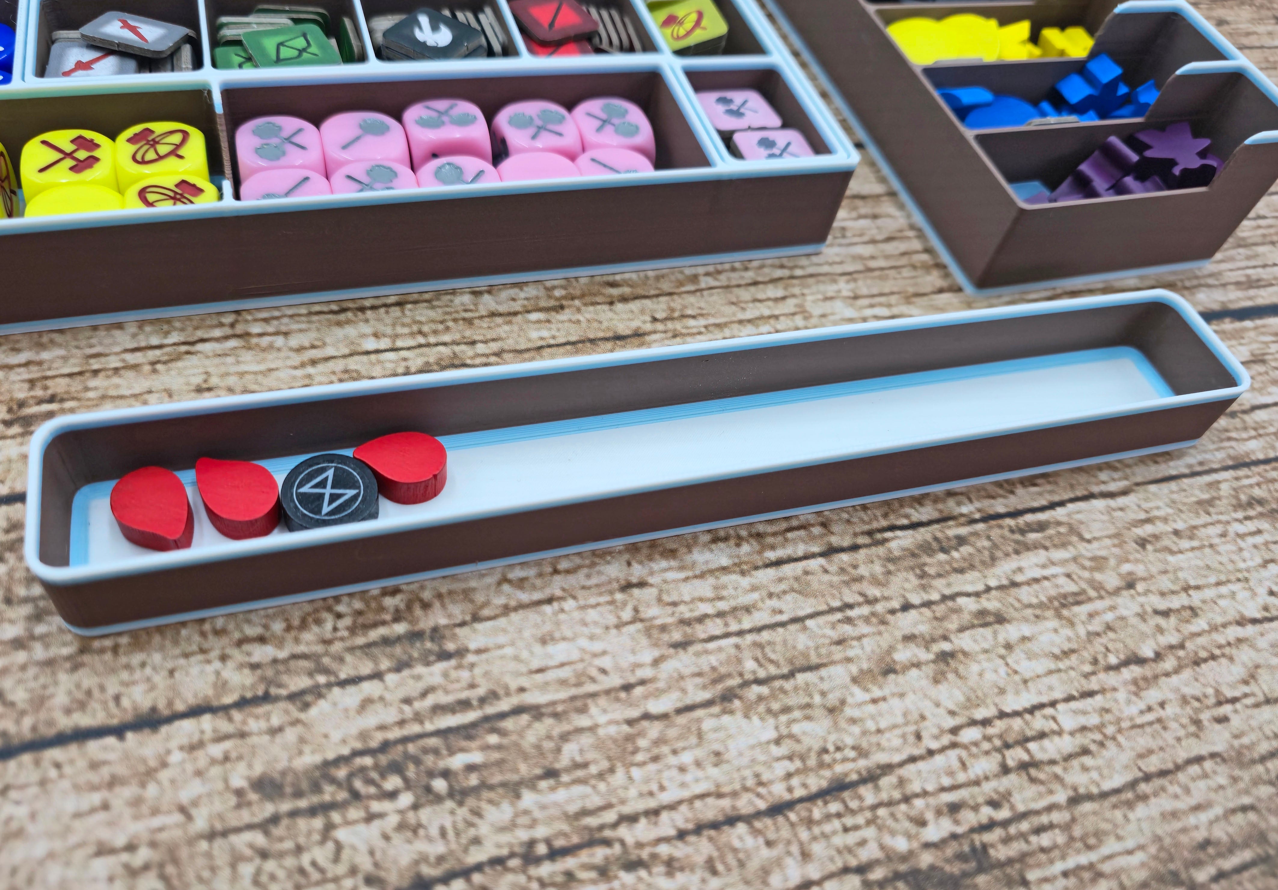 1x tray for the starting player token, all dice, and a removable tray for the sacrifice tokens